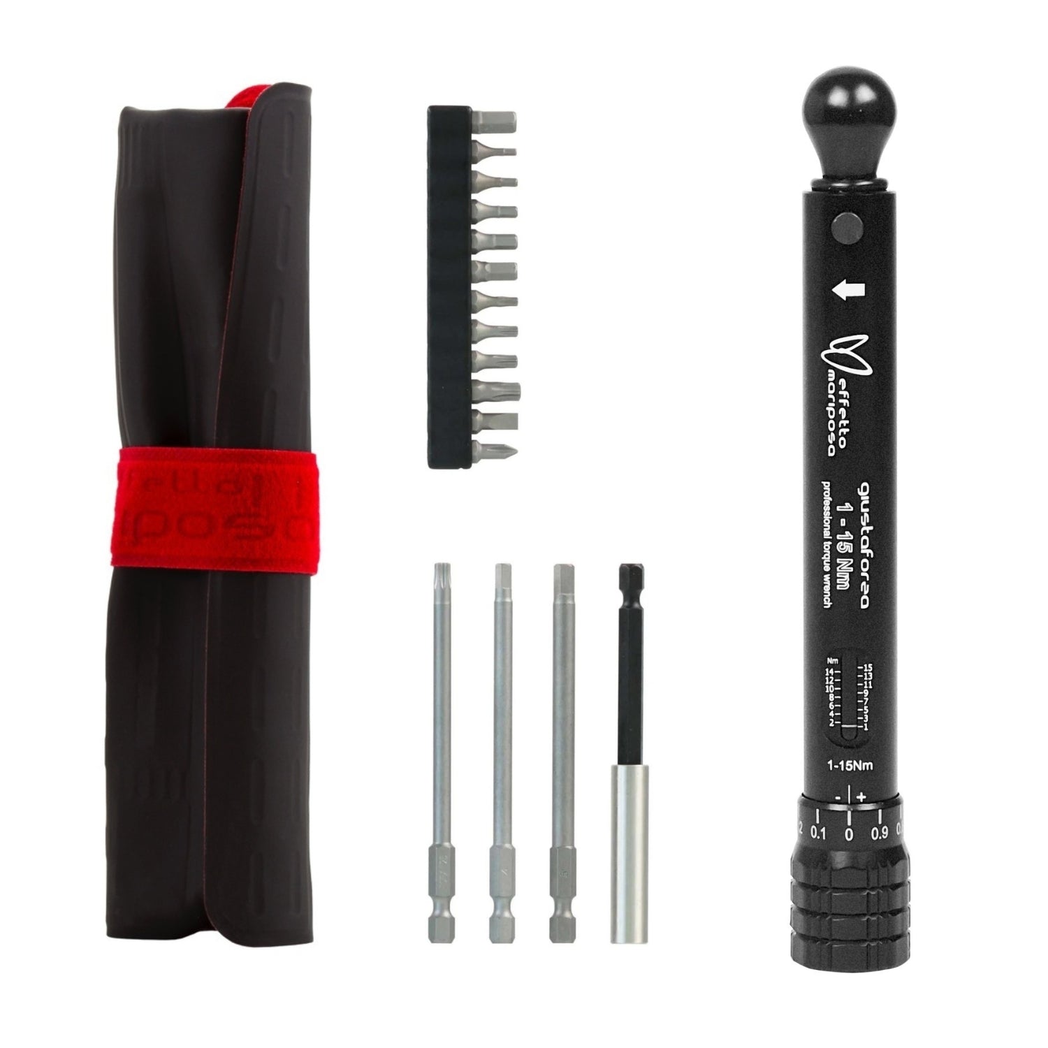A home-mechanic’s dream tool, Giustaforza 1-15 Fixed torque wrench has a very small head, to operate in tight spaces. The Deluxe version is completed with cycling-specific bits and comes in a practical wrap package.