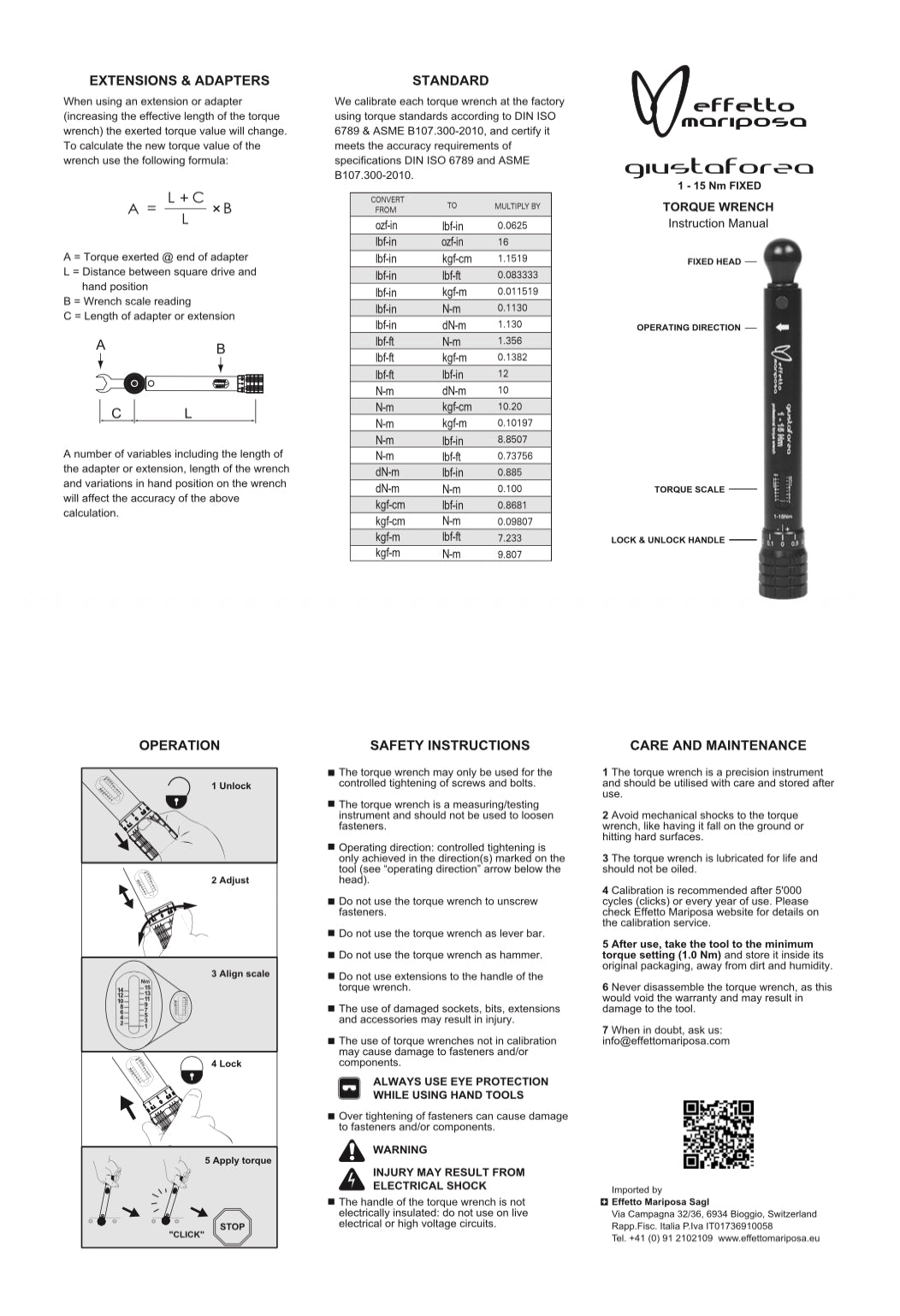 - Giustaforza 1-15 Fixed & Pro: NOT CALIBRATED for anti-clockwise tightening. The wrench can also be used to unscrew, but it does not click at the set torque;